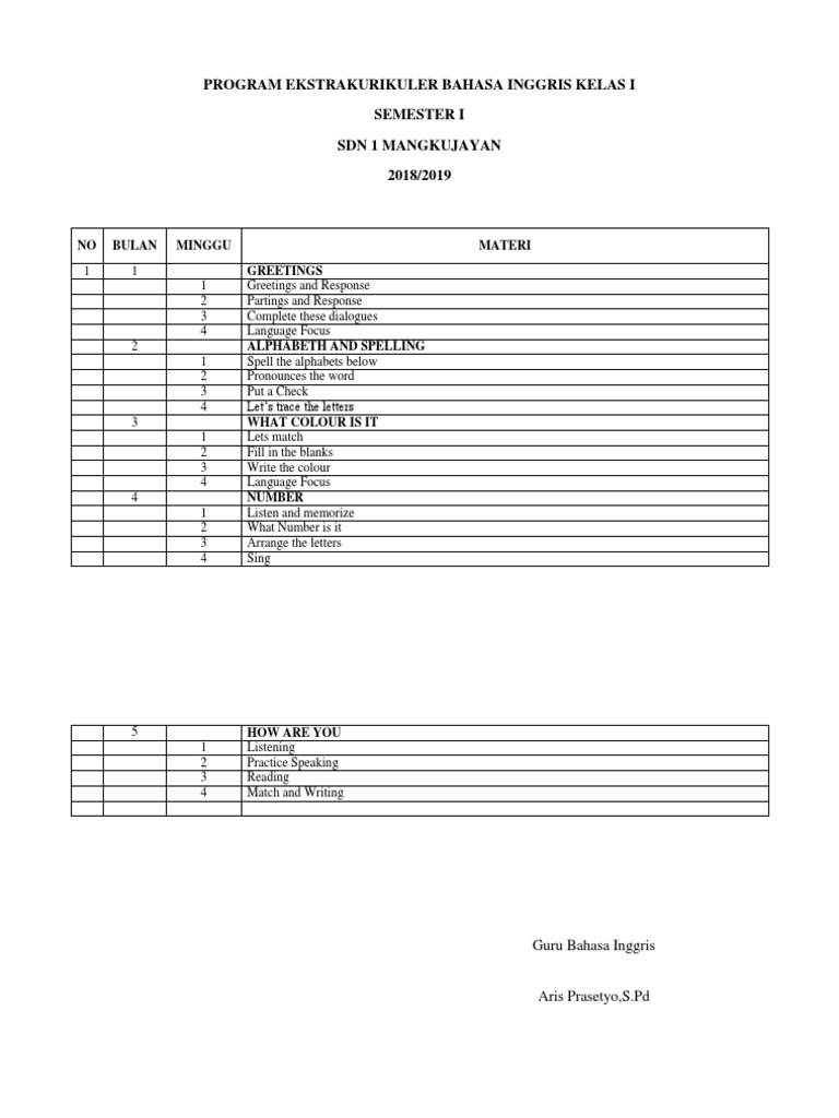 Download Program Kerja Ekstrakurikuler Bahasa Inggris Sd - Contoh Program Kerja Ekstrakurikuler Bahasa Inggris Smp Temukan Contoh / Di sini saya akan berbagi program kerja ekstrakurikuler yang ada di smp &sma.. Download ekstrakurikuler program kerja dan jadwal pembiasaan bahasa asing tahun pelajaran 2019/2020. Program semester k 13 revisi b inggris klass vii. Download program kerja dan jadwal ekstrakurikuler drum band / marching band tahun pelajaran 2019/2020 wednesday, august 7, 2019 add comment edit ekstrakurikuler merupakan kegiatan pembelajaran di luar pelajaran formal yang dilakukan opel siswa atau peserta didik di satuan pendidikan atau sekolah baik ditingkat sd/mi, smp/mts, sma/ma/smk/mak. Buruan download gratis dan lengkap contoh program kerja dan jadwal bulu tangkis contoh program kerja dan jadwal drun band contoh program kerja dan jadwal kegiatan kesiswaan contoh program kerja dan jadwal kelompok ilmiah remaja contoh program kerja dan jadwal kesenian contoh program kerja dan jadwal lab komputer contoh program kerja dan jadwal osis contoh program kerja dan jadwal pembiasaan. Sehubungan dengan hal tersebut diatas tersurat dalam struktur kurikulum salah satu mata.